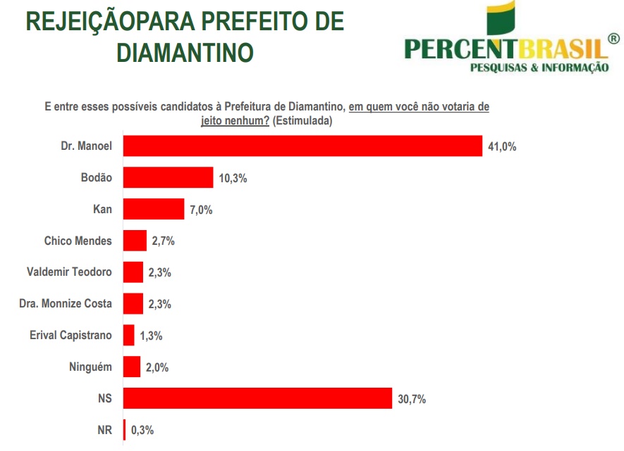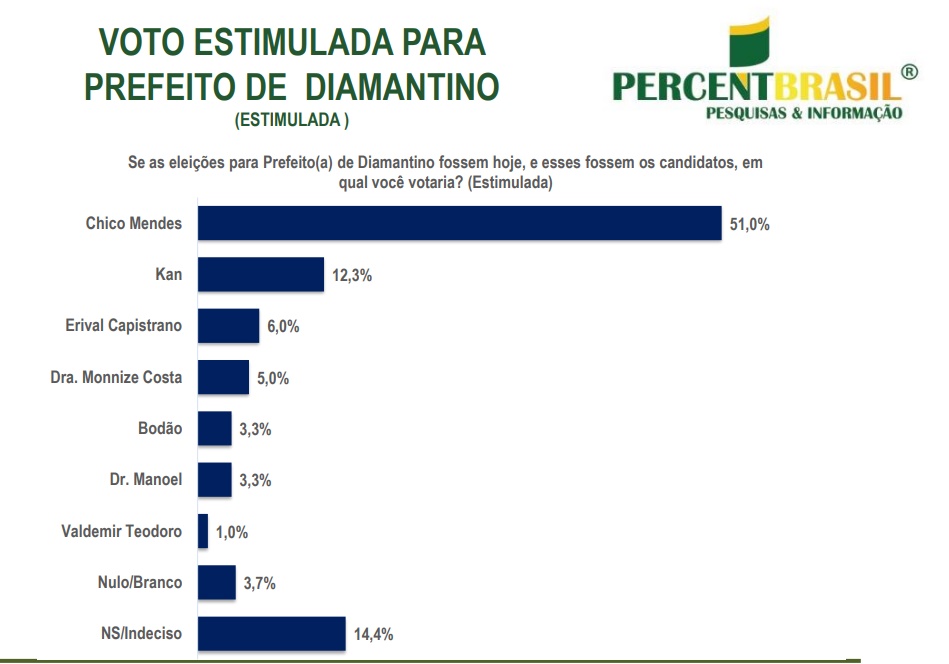 Pesquisa quantitativa realizada pela PercentBrasil, em Diamantino, mostra o pré-candidato a prefeito Chico Mendes (União) liderando com folga a disputa.